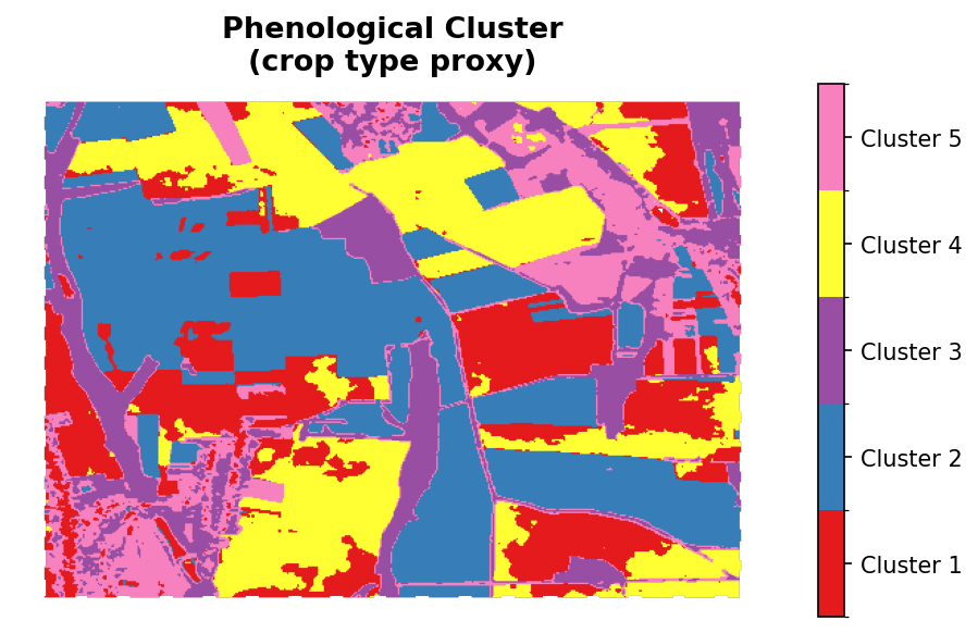 The system operates without any labelled training data or field surveys — crop type proxies and stress signals emerge entirely from the temporal structure of the satellite record.